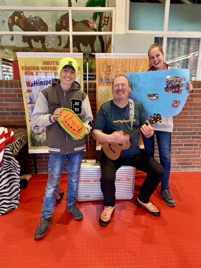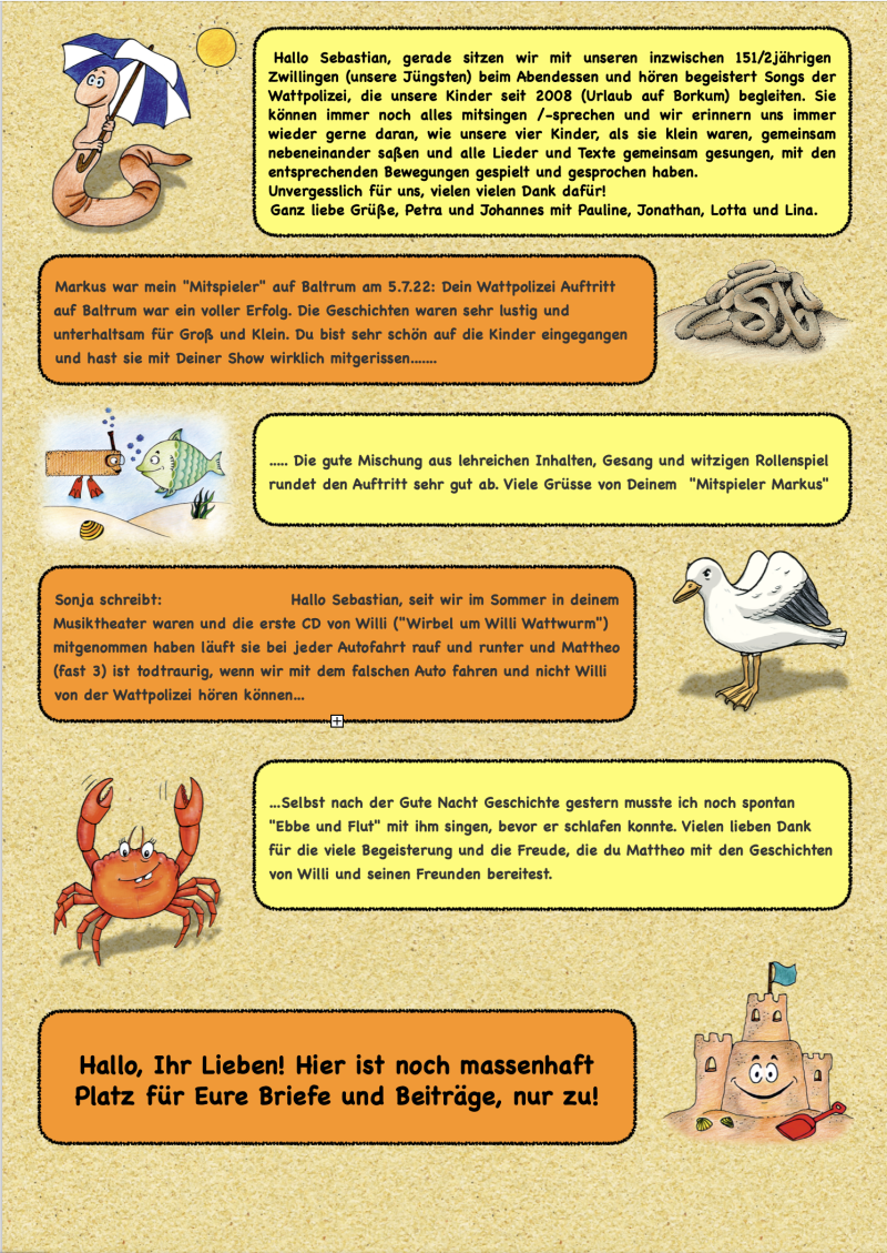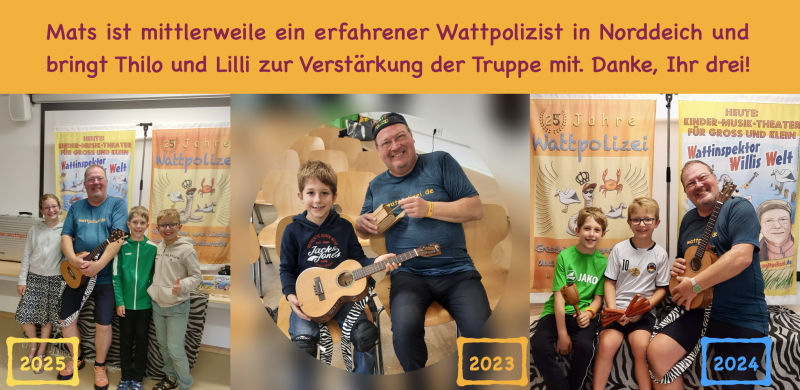Kinder, wie die Zeit vergeht ... Jetzt ist sie schon über 25 Jahre her, die erste Vorstellung der Wattpolizei 1998 auf Langeoog. Seitdem haben Wattinspektor Willi, Katrin Krabbe, Hubert Heuler, Magdalena Möwe und ich hunderte Auftritte im Friesischen gespielt. Das geht natürlich auch 2025 weiter, kommt und seid dabei, Termine stehen weiter hinten! Wir freuen uns auf drauf!
