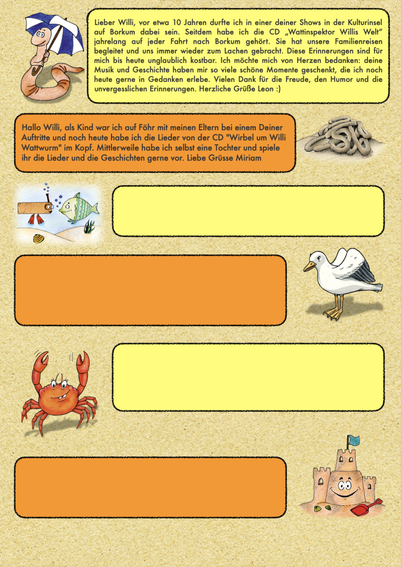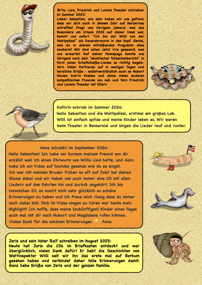 Liebe Freundinnen und Freunde der Wattpolizei, nachdem ich immer und immer wieder viele viele Spambeiträge vom Gästebuch löschen musste, habe ich mir nun eine andere Lösung überlegt: Schreibt doch einfach eine Mail an Willi, Katrin, Hubert oder Magdalena und ich setze die dann in so ein buntes Textfeld ein. Also los ... worauf wartet Ihr noch? Euer Platz auf diesem neuen Gästebuch ist für Euch schon reserviert!